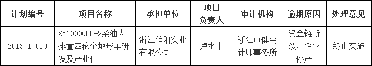 根據(jù)《金華市級科技計劃項目驗收管理辦法》(金市科字〔2015〕83號)相關(guān)規(guī)定,經(jīng)研究,我局擬對浙江信陽實業(yè)有限公司承擔的市級科技計劃項目“XY1000CUE-2柴油大排量四輪全地形車研發(fā)及產(chǎn)業(yè)化”(計劃編號:2013-1-010)進行終止處理,對項目負責人和主要股東記錄不良科研信用?,F(xiàn)予以公示,自公示之日起5個工作日內(nèi),有關(guān)單位或個人如有異議,應(yīng)當以實名與我局聯(lián)系。聯(lián)系方式:金華市科技局工業(yè)與高新技術(shù)處,電話:82469791;市紀委駐市科技局紀檢監(jiān)察組,電話:82387952。