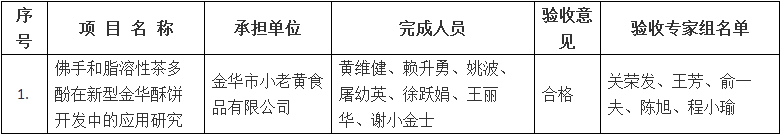 根據(jù)《金華市級(jí)科技計(jì)劃項(xiàng)目驗(yàn)收管理辦法》(金市科字〔2015〕83號(hào))規(guī)定,現(xiàn)將金華市小老黃食品有限公司承擔(dān)的《佛手和脂溶性茶多酚在新型金華酥餅開(kāi)發(fā)中的應(yīng)用研究》市級(jí)科技計(jì)劃項(xiàng)目驗(yàn)收結(jié)果予以公示,接受社會(huì)監(jiān)督,公示期從2018年8月21日至2018年8月28日止。任何單位和個(gè)人對(duì)驗(yàn)收意見(jiàn)持有異議的,應(yīng)當(dāng)在公示期內(nèi)書(shū)面向市科技局提出異議,單位應(yīng)采用書(shū)面形式并加蓋公章,個(gè)人應(yīng)采用實(shí)名提出異議。