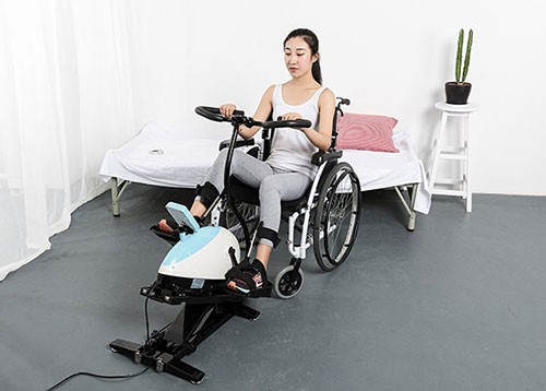 智能康復(fù)訓(xùn)練器材包括底座,在兩側(cè)對稱的基礎(chǔ)上,分別在每個支架的內(nèi)側(cè)安裝連接塊,連接件由電動推桿與垂直設(shè)置連接,實(shí)現(xiàn)連接件在直線導(dǎo)向柱上的上下滑動。